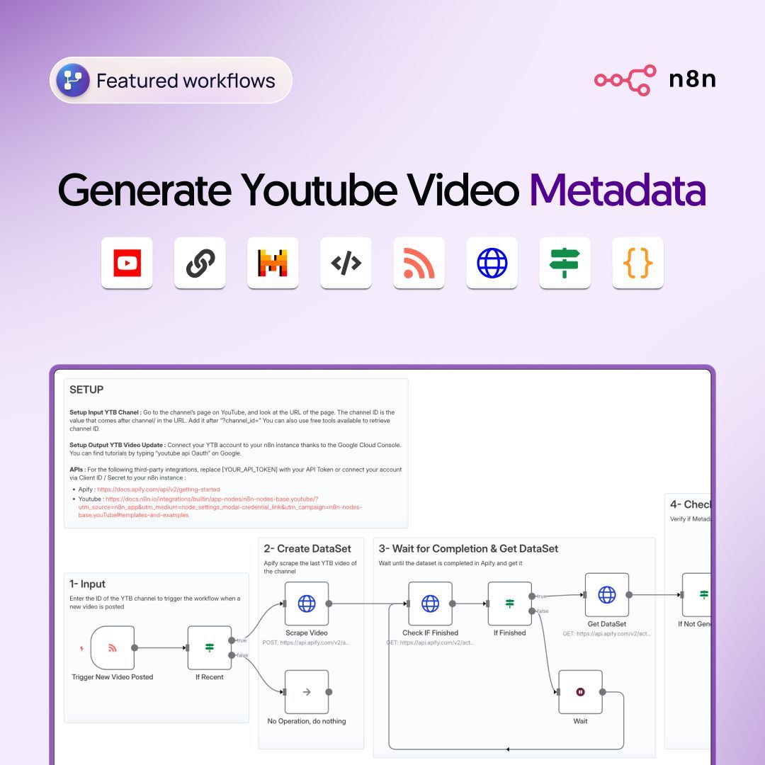 n8nを使用してYouTube動画のメタデータ(タイムスタンプ、タグ、説明文)を自動生成する革新的なワークフローを解説。動画コンテンツクリエイターの作業時間を大幅に削減し、SEO効果を最大化する方法を詳しく紹介します。