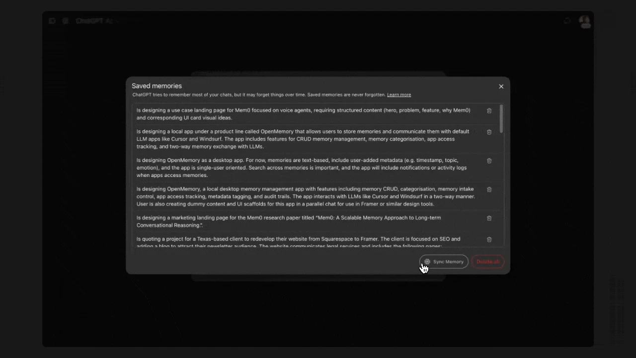 AIとの会話が進むにつれて、OpenMemoryはリアルタイムで文脈を保存。別のAIに切り替えても、まるで同じアシスタントと話しているかのような体験を提供します。